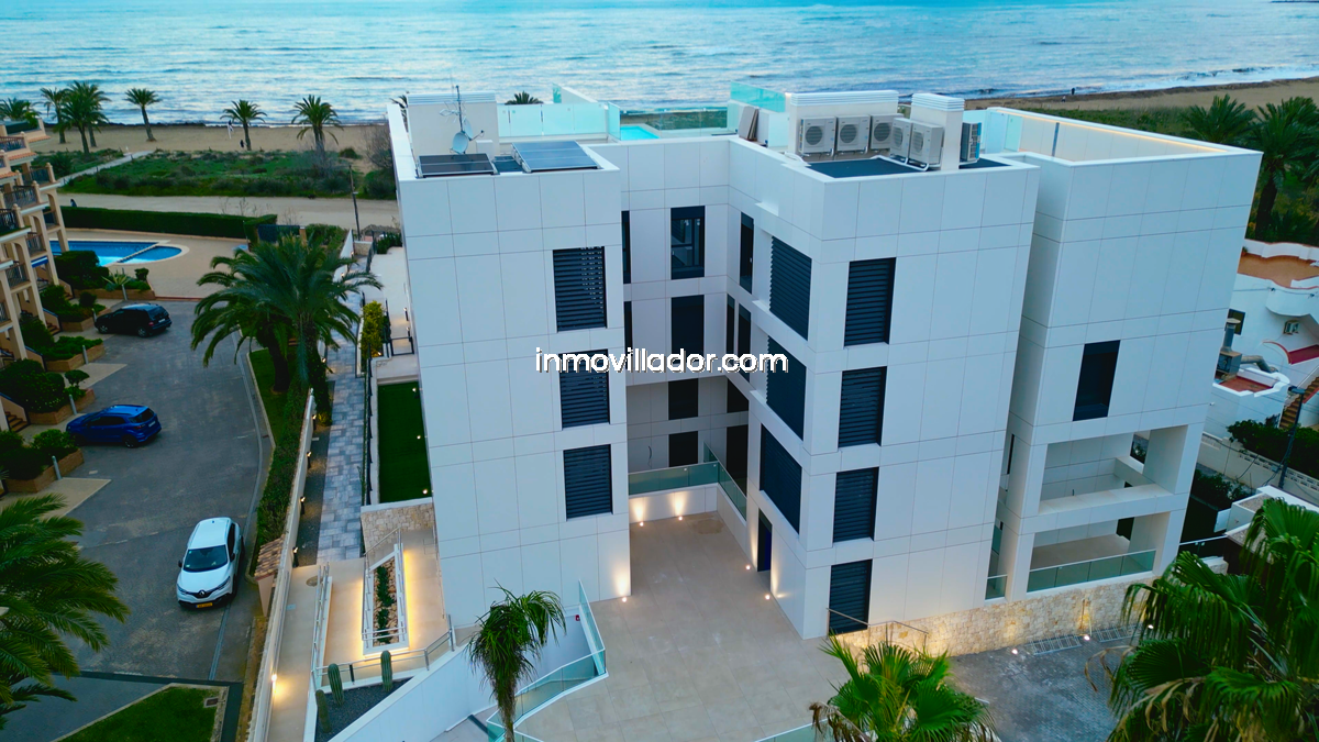 Apartamento de obra nueva en 1ª línea de playa. Descubre esta exclusiva vivienda de obra nueva, ubicada en primera línea de playa en una de las zonas más demandadas de Dénia. Situado en la segunda planta, este elegante apartamento cuenta con una superficie construida aproximada de 102 m² y ha sido diseñado para ofrecer confort, diseño y calidad en cada detalle. La distribución interior incluye 2 dormitorios, uno de ellos con vestidor, 2 baños completos, un espacioso salón-comedor y una cocina de estilo abierto, moderna y funcional, además de una zona de lavandería independiente. El salón se conecta con una amplia terraza, parcialmente cubierta y descubierta, ideal para disfrutar del entorno en cualquier momento del día. Incluye en el precio una plaza de aparcamiento exterior. También existe la opción de adquirir trasteros desde 19.000 €. Este residencial de lujo ha sido concebido para quienes buscan un estilo de vida exclusivo junto al mar. El acceso directo a la playa, la amplitud de los espacios y la calidad de sus acabados ofrecen una experiencia de bienestar y sofisticación única. Entre sus calidades destacan los armarios empotrados, la calefacción por suelo radiante, el aire acondicionado por conductos y una cocina equipada con mobiliario de diseño, pensada para quienes valoran tanto la estética como la funcionalidad. Además, de un garaje cerrado tipo box con cargador para vehículo eléctrico. Ubicado a pocos minutos a pie del centro de Dénia y de todos los servicios, esta propiedad representa una oportunidad inmejorable para vivir el lujo y la tranquilidad junto al Mediterráneo.